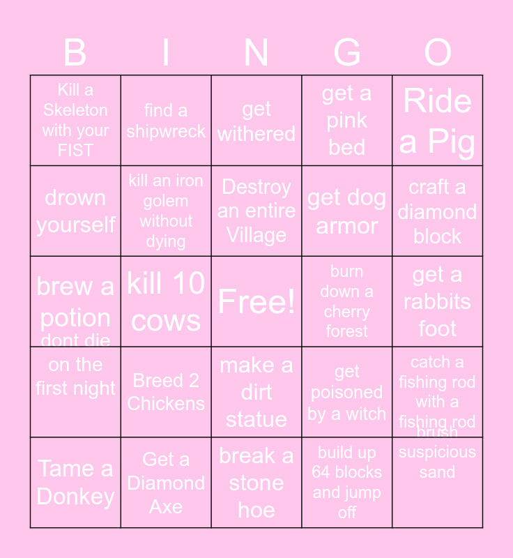 This bingo card has a free space and 24 words: Breed 2 Chickens, Get a Diamond Axe, Destroy an entire Village, Tame a Donkey, Ride a Pig, Kill a Skeleton with your FIST, drown yourself, find a shipwreck, burn down a cherry forest, make a dirt statue, get dog armor, brew a potion, get poisoned by a witch, catch a fishing rod with a fishing rod, kill an iron golem without dying, build up 64 blocks and jump off, get a rabbits foot, get withered, craft a diamond block, kill 10 cows, brush suspicious sand, dont die on the first night, get a pink bed and break a stone hoe.