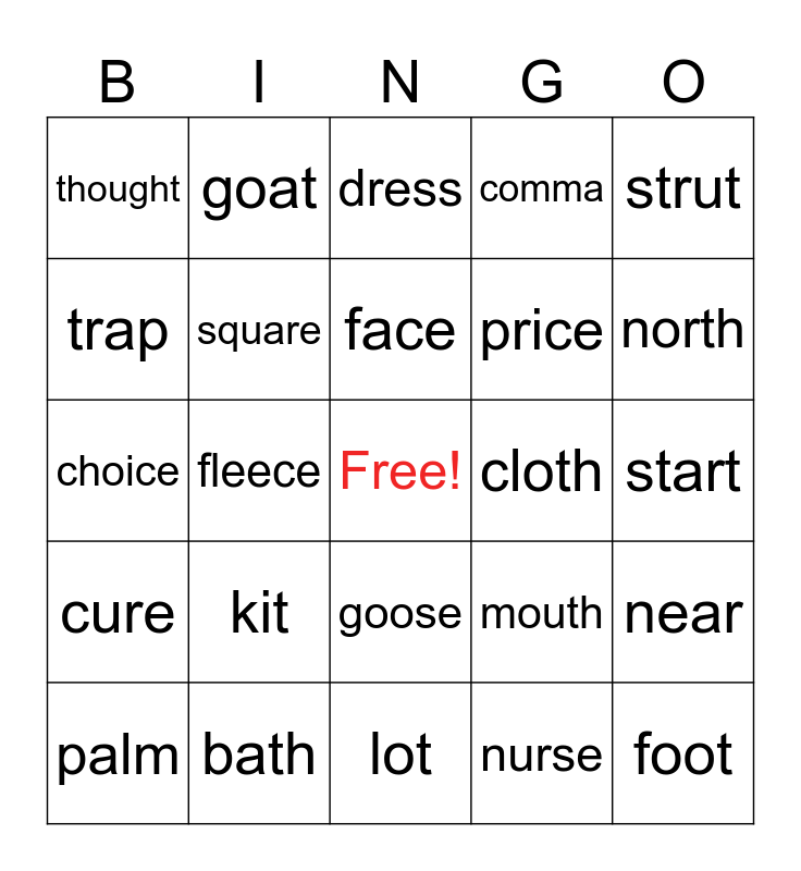 This bingo card has a free space and 24 words: kit, bath, face, palm, strut, thought, trap, goat, cloth, goose, price, choice, mouth, near, square, nurse, start, dress, north, fleece, foot, cure, comma and lot.