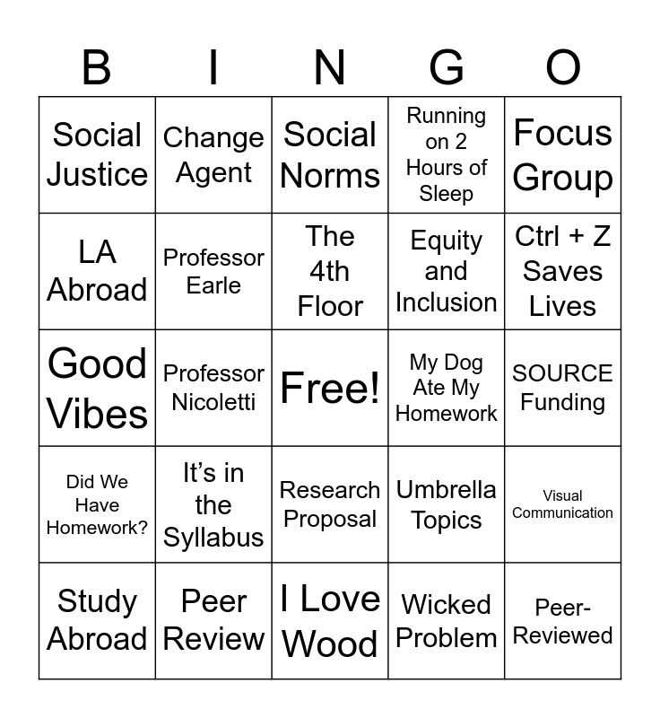 This bingo card has a free space and 47 words: Think Tank, Peer-Reviewed, Research in Practice, I Love Wood, It’s in the Syllabus, Ready for Summer, Change Agent, Smith Hall, LA Abroad, Data Analysis, Professor Earle, Running on 2 Hours of Sleep, Visual Communication, Umbrella Topics, Digital Tools, Group Project Panic, The 4th Floor, My Dog Ate My Homework, Professor Heckman, Focus Group, Professor Nicoletti, Wicked Problem, Social Justice, Equity and Inclusion, Social Impact, Ctrl + Z Saves Lives, Study Abroad, The Warehouse, Research Proposal, Did We Have Homework?, Dr. Emily, Literature Review, Dr. Kowalski, Design Issues, Design Thinking, Peer Review, SOURCE Funding, Design Research, Google Scholar, Dr. J, Graphs and Charts, Social Norms, Good Vibes, Group Project, Free Pizza, Project Management and Dr. Fathers.