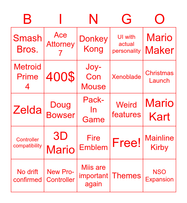 This bingo card has 25 words: 3D Mario, Miis are important again, Joy-Con Mouse, No drift confirmed, Mario Maker, Smash Bros., Metroid Prime 4, Ace Attorney 7, Weird features, Fire Emblem, Xenoblade, Zelda, Free!, Mainline Kirby, 400$, NSO Expansion, Mario Kart, Donkey Kong, Christmas Launch, Doug Bowser, Pack-In Game, New Pro-Controller, Controller compatibility, UI with actual personality and Themes.