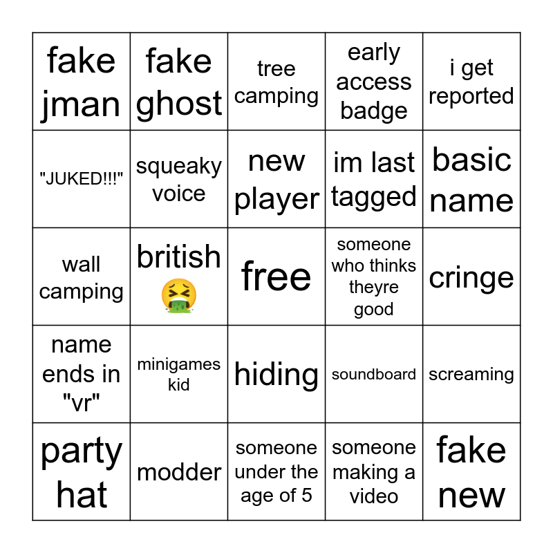 This bingo card has a free space and 24 words: minigames kid, modder, new player, party hat, i get reported, fake jman, "JUKED!!!", fake ghost, someone who thinks theyre good, hiding, im last tagged, wall camping, soundboard, screaming, squeaky voice, someone making a video, cringe, tree camping, basic name, british 🤮, fake new, name ends in "vr", early access badge and someone under the age of 5.