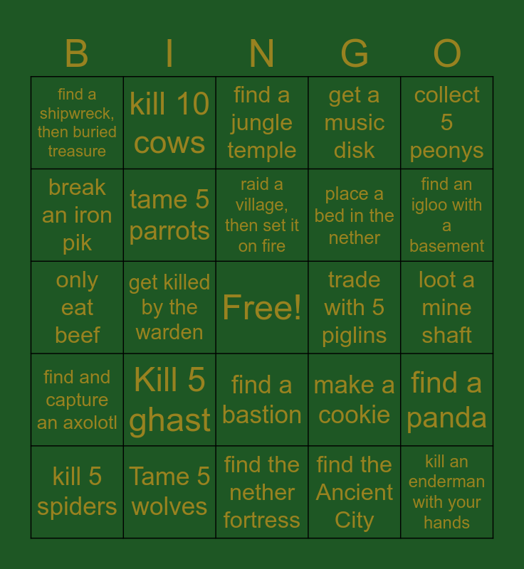 This bingo card has a free space and 24 words: Kill 5 ghast, Tame 5 wolves, raid a village, then set it on fire, kill 5 spiders, collect 5 peonys, find a shipwreck, then buried treasure, break an iron pik, kill 10 cows, trade with 5 piglins, find a bastion, place a bed in the nether, only eat beef, make a cookie, find a panda, tame 5 parrots, find the Ancient City, loot a mine shaft, find a jungle temple, find an igloo with a basement, get killed by the warden, kill an enderman with your hands, find and capture an axolotl, get a music disk and find the nether fortress.