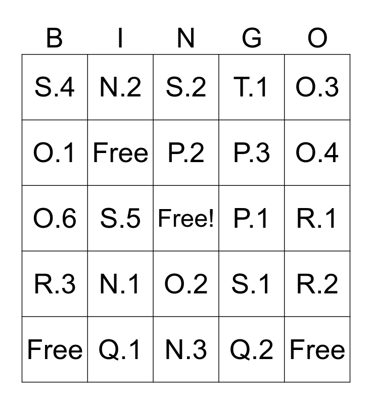This bingo card has a free space and 24 words: N.1, Q.1, P.2, Free, O.3, S.4, O.1, N.2, P.1, O.2, P.3, O.6, S.1, R.2, Free, Q.2, R.1, S.2, O.4, S.5, Free, R.3, T.1 and N.3.