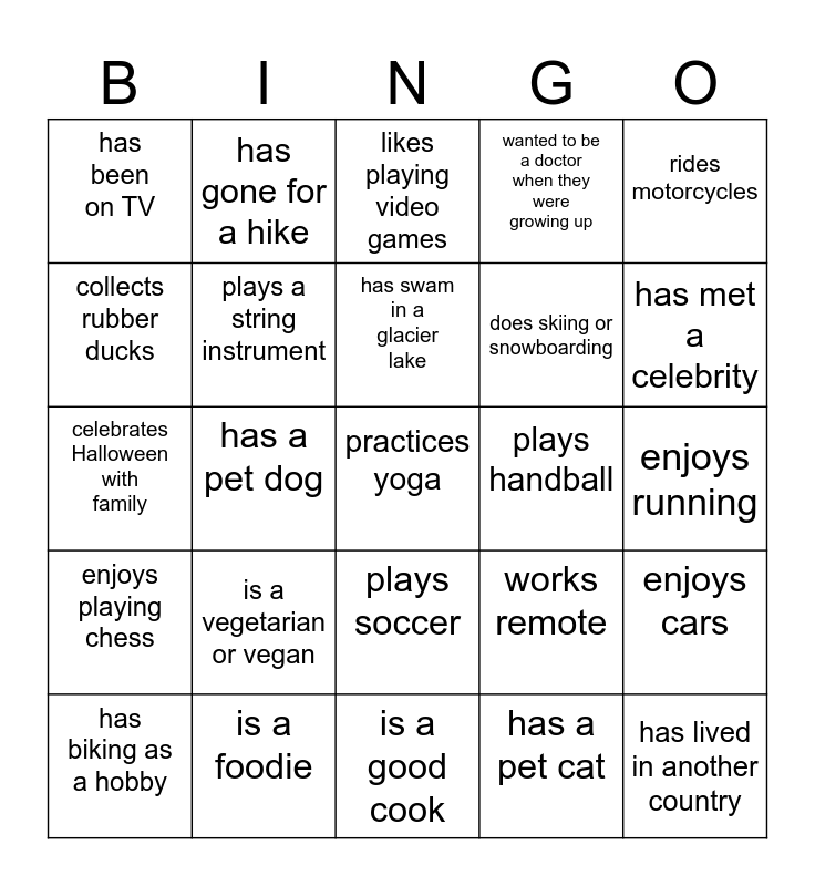 This bingo card has 35 words: has an allergy, has run an obstacle course race, speaks two or more languages, plays a string instrument, plays soccer, wanted to be a doctor when they were growing up, collects rubber ducks, has worked on a magazine, has swam in a glacier lake, enjoys more than one genre of music, celebrates Halloween with family, rides motorcycles, enjoys road trips, can drive a stick shift car, has been on TV, plays handball, has a pet cat, has a pet dog, enjoys playing chess, practices yoga, works remote, has biking as a hobby, enjoys cars, is a foodie, likes playing video games, has met a celebrity, has lived in another country, wears glasses, does skiing or snowboarding, enjoys running, likes to make artwork, is a good cook, is a vegetarian or vegan, has gone for a hike and knows how to surf.