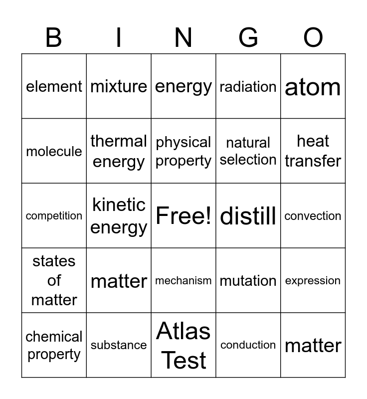 This bingo card has a free space and 24 words: matter, substance, physical property, chemical property, atom, element, molecule, mixture, distill, mechanism, natural selection, competition, mutation, expression, thermal energy, conduction, convection, energy, heat transfer, kinetic energy, matter, states of matter, radiation and Atlas Test.