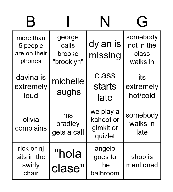 This bingo card has 16 words: "hola clase", somebody walks in late, dylan is missing, more than 5 people are on their phones, olivia complains, george calls brooke "brooklyn", we play a kahoot or gimkit or quizlet, angelo goes to the bathroom, davina is extremely loud, michelle laughs, rick or nj sits in the swirly chair, somebody not in the class walks in, ms bradley gets a call, its extremely hot/cold, class starts late and shop is mentioned.