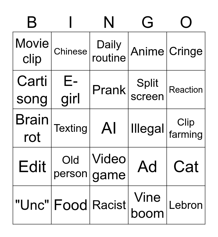 This bingo card has 25 words: Old person, Racist, Prank, "Unc", Cringe, Movie clip, Carti song, Chinese, Illegal, Video game, Split screen, Brain rot, Ad, Cat, E-girl, Lebron, Clip farming, Daily routine, Reaction, Texting, AI, Food, Edit, Anime and Vine boom.
