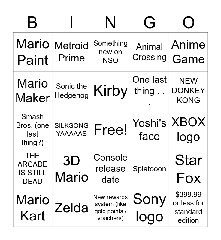 This bingo card has a free space and 24 words: 3D Mario, Zelda, Kirby, Mario Kart, Anime Game, Mario Paint, Mario Maker, Metroid Prime, Yoshi's face, Console release date, One last thing . . ., Smash Bros. (one last thing?), Splatooon, Star Fox, Sonic the Hedgehog, Sony logo, XBOX logo, Something new on NSO, NEW DONKEY KONG, SILKSONG YAAAAAS, $399.99 or less for standard edition, THE ARCADE IS STILL DEAD, Animal Crossing and New rewards system (like gold points / vouchers).