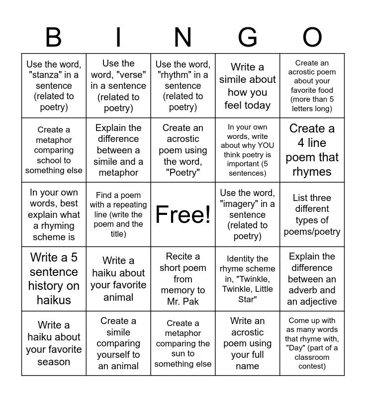 This bingo card has a free space and 24 words: Write a haiku about your favorite season, Write a haiku about your favorite animal, Create an acrostic poem using the word, "Poetry", Write an acrostic poem using your full name, Create an acrostic poem about your favorite food (more than 5 letters long), Use the word, "stanza" in a sentence (related to poetry), Use the word, "verse" in a sentence (related to poetry), Use the word, "rhythm" in a sentence (related to poetry), Use the word, "imagery" in a sentence (related to poetry), List three different types of poems/poetry, In your own words, best explain what a rhyming scheme is, Explain the difference between a simile and a metaphor, Identity the rhyme scheme in, "Twinkle, Twinkle, Little Star", Explain the difference between an adverb and an adjective, Create a metaphor comparing school to something else, Create a simile comparing yourself to an animal, Create a metaphor comparing the sun to something else, Write a simile about how you feel today, Create a 4 line poem that rhymes, Write a 5 sentence history on haikus, Find a poem with a repeating line (write the poem and the title), Recite a short poem from memory to Mr. Pak, In your own words, write about why YOU think poetry is important (5 sentences) and Come up with as many words that rhyme with, "Day" (part of a classroom contest).