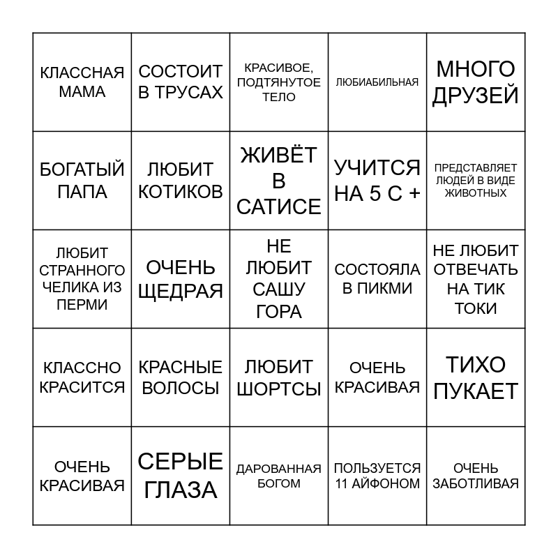 This bingo card has a free space and 24 words: КРАСНЫЕ ВОЛОСЫ, СЕРЫЕ ГЛАЗА, ЖИВЁТ В САТИСЕ, ОЧЕНЬ КРАСИВАЯ, МНОГО ДРУЗЕЙ, КЛАССНАЯ МАМА, БОГАТЫЙ ПАПА, СОСТОИТ В ТРУСАХ, СОСТОЯЛА В ПИКМИ, ЛЮБИТ ШОРТСЫ, УЧИТСЯ НА 5 С +, ЛЮБИТ СТРАННОГО ЧЕЛИКА ИЗ ПЕРМИ, ОЧЕНЬ КРАСИВАЯ, ТИХО ПУКАЕТ, ЛЮБИТ КОТИКОВ, ПОЛЬЗУЕТСЯ 11 АЙФОНОМ, НЕ ЛЮБИТ ОТВЕЧАТЬ НА ТИК ТОКИ, КРАСИВОЕ, ПОДТЯНУТОЕ ТЕЛО, ПРЕДСТАВЛЯЕТ ЛЮДЕЙ В ВИДЕ ЖИВОТНЫХ, ОЧЕНЬ ЩЕДРАЯ, ОЧЕНЬ ЗАБОТЛИВАЯ, КЛАССНО КРАСИТСЯ, ЛЮБИАБИЛЬНАЯ and ДАРОВАННАЯ БОГОМ.