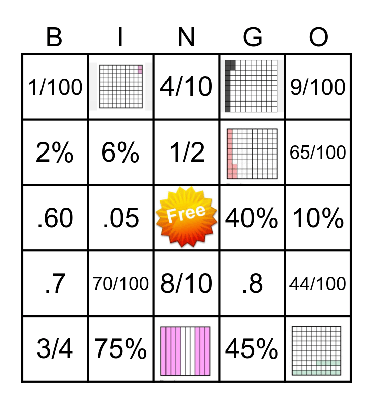 This bingo card has 6 images, a free space and 27 words: .5, 20%, .05, 40/100, .7, 6%, 9/100, 3/4, 15/100, 1/2, 4/10, 0.35, .65, 40%, 65/100, 75%, .60, 70/100, .8, 8/10, 50%, 1/100, 10%, 2%, 44/100, .61% and 45%.