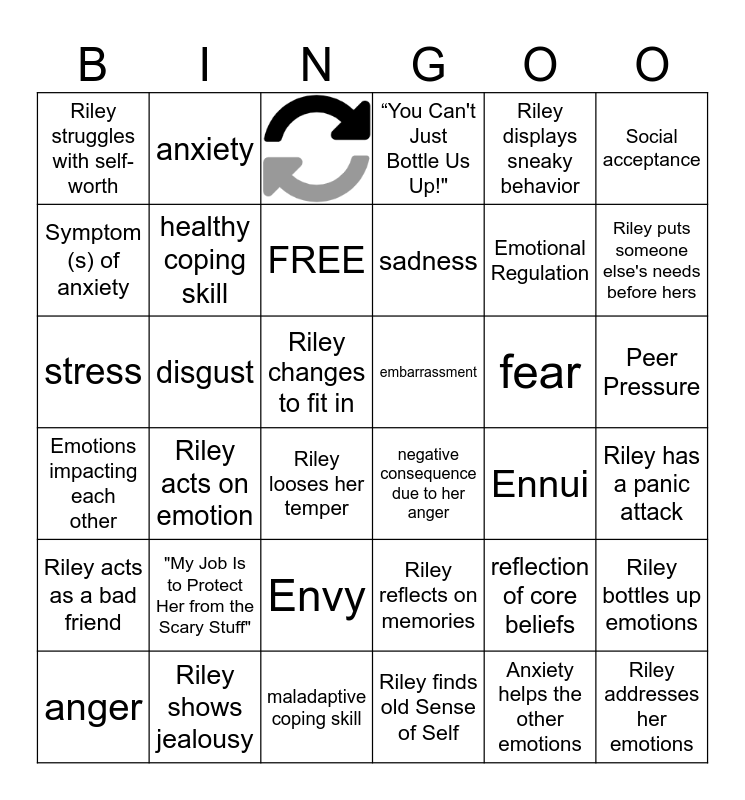 This bingo card has 1 images and 35 words: Emotions impacting each other, Riley acts on emotion, maladaptive coping skill, sadness, fear, Peer Pressure, Riley struggles with self-worth, Riley shows jealousy, Riley reflects on memories, Emotional Regulation, Social acceptance, Riley acts as a bad friend, disgust, FREE, “You Can't Just Bottle Us Up!", reflection of core beliefs, Riley has a panic attack, Symptom (s) of anxiety, healthy coping skill, Riley looses her temper, negative consequence due to her anger, Ennui, Riley bottles up emotions, stress, anxiety, Riley changes to fit in, Riley finds old Sense of Self, Riley displays sneaky behavior, Riley puts someone else's needs before hers, anger, "My Job Is to Protect Her from the Scary Stuff", Envy, embarrassment, Anxiety helps the other emotions and Riley addresses her emotions.