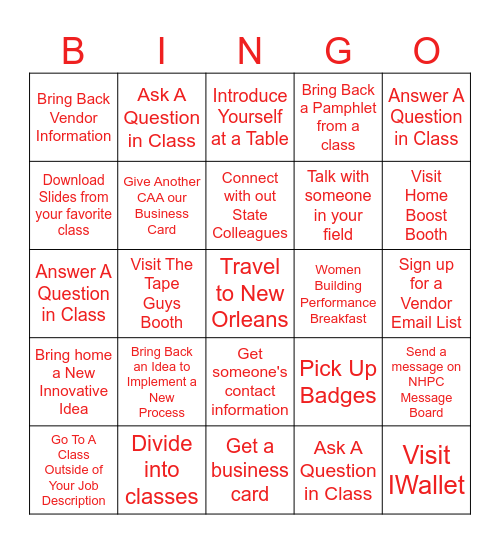 This bingo card has a free space and 24 words: Go To A Class Outside of Your Job Description, Bring Back an Idea to Implement a New Process, Connect with out State Colleagues, Ask A Question in Class, Answer A Question in Class, Bring Back Vendor Information, Ask A Question in Class, Introduce Yourself at a Table, Women Building Performance Breakfast, Sign up for a Vendor Email List, Answer A Question in Class, Give Another CAA our Business Card, Pick Up Badges, Send a message on NHPC Message Board, Download Slides from your favorite class, Divide into classes, Get a business card, Bring Back a Pamphlet from a class, Visit Home Boost Booth, Bring home a New Innovative Idea, Visit The Tape Guys Booth, Get someone's contact information, Talk with someone in your field and Visit IWallet.