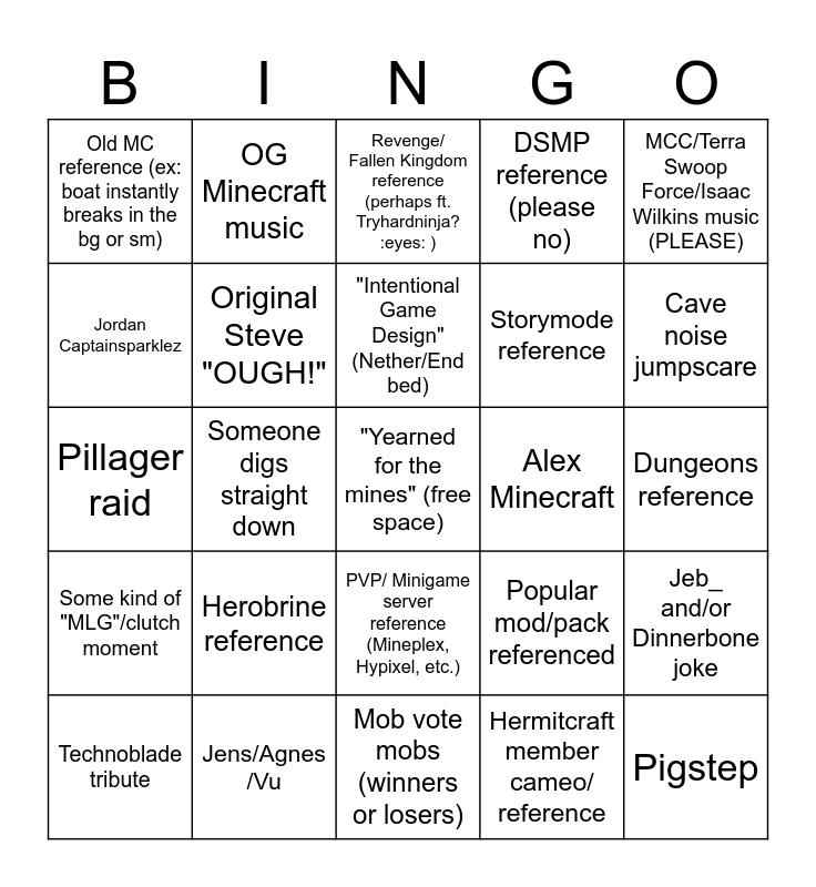 This bingo card has a free space and 24 words: Herobrine reference, Jens/Agnes /Vu, "Intentional Game Design" (Nether/End bed), Technoblade tribute, MCC/Terra Swoop Force/Isaac Wilkins music (PLEASE), Old MC reference (ex: boat instantly breaks in the bg or sm), Jordan Captainsparklez, OG Minecraft music, Alex Minecraft, PVP/ Minigame server reference (Mineplex, Hypixel, etc.), Storymode reference, Pillager raid, Popular mod/pack referenced, Jeb_ and/or Dinnerbone joke, Original Steve "OUGH!", Hermitcraft member cameo/ reference, Dungeons reference, Revenge/ Fallen Kingdom reference (perhaps ft. Tryhardninja? :eyes: ), Cave noise jumpscare, Someone digs straight down, Pigstep, Some kind of "MLG"/clutch moment, DSMP reference (please no) and Mob vote mobs (winners or losers).
