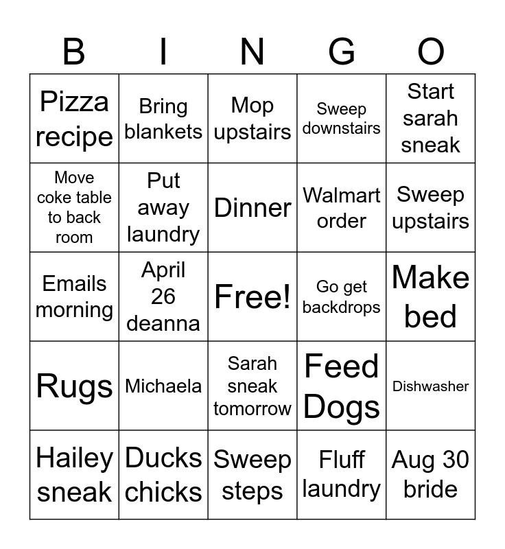 This bingo card has a free space and 24 words: Michaela, Ducks chicks, Dinner, Hailey sneak, Start sarah sneak, Pizza recipe, Move coke table to back room, Bring blankets, Go get backdrops, Sarah sneak tomorrow, Walmart order, Emails morning, Feed Dogs, Dishwasher, Put away laundry, Fluff laundry, Make bed, Mop upstairs, Sweep upstairs, April 26 deanna, Aug 30 bride, Rugs, Sweep downstairs and Sweep steps.
