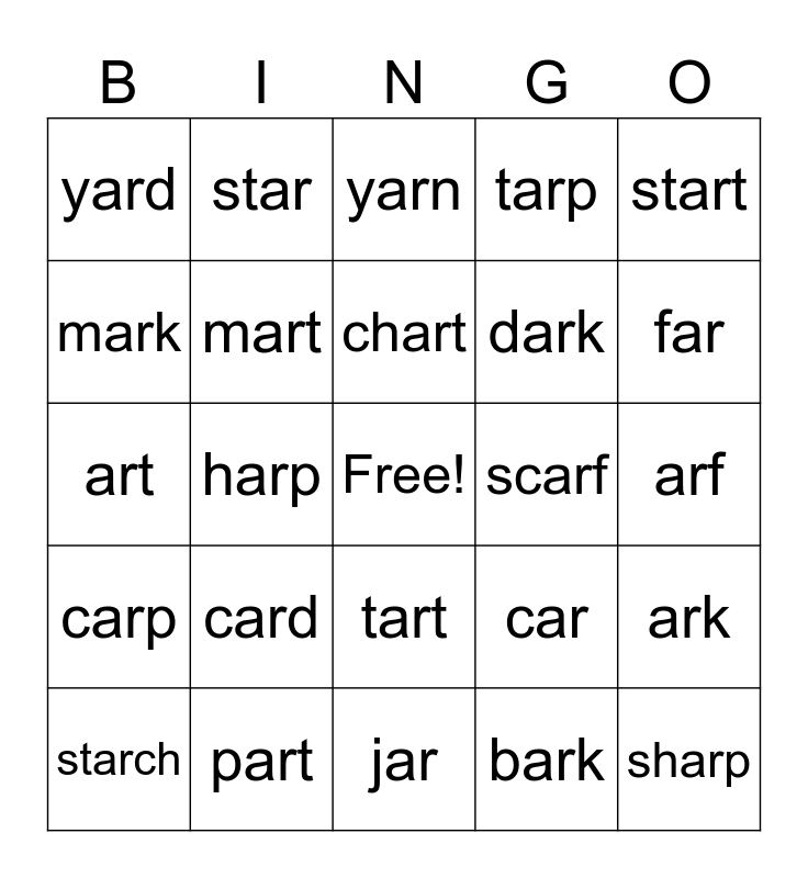 This bingo card has a free space and 40 words: cart, art, dart, mart, part, tart, chart, smart, start, carp, harp, tarp, sharp, arf, scarf, card, hard, yard, barn, yarn, ark, bark, dark, mark, park, shark, spark, farm, harm, charm, march, starch, bar, car, far, jar, tar, scar, star and lark.