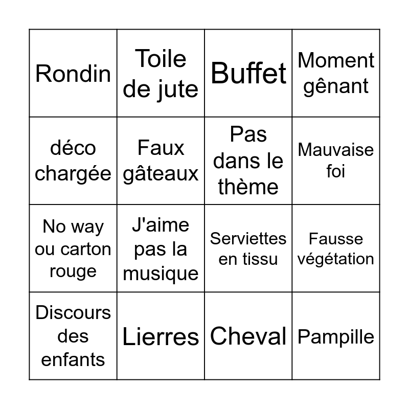 This bingo card has 16 words: Lierres, Fausse végétation, Buffet, Rondin, No way ou carton rouge, Toile de jute, Serviettes en tissu, Cheval, déco chargée, Faux gâteaux, Discours des enfants, Moment gênant, J'aime pas la musique, Mauvaise foi, Pas dans le thème and Pampille.
