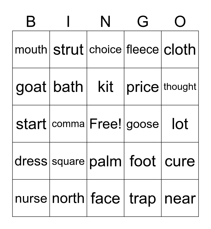 This bingo card has a free space and 24 words: square, north, kit, nurse, cloth, mouth, goat, strut, goose, palm, price, start, foot, cure, bath, trap, lot, choice, thought, comma, near, dress, fleece and face.