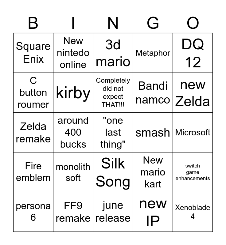 This bingo card has 25 words: monolith soft, june release, Completely did not expect THAT!!!, persona 6, DQ 12, Square Enix, C button roumer, New nintedo online, smash, Silk Song, Bandi namco, Zelda remake, New mario kart, switch game enhancements, kirby, Xenoblade 4, Microsoft, 3d mario, new Zelda, around 400 bucks, "one last thing", FF9 remake, Fire emblem, Metaphor and new IP.