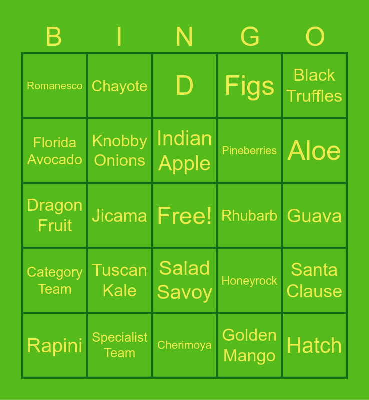 This bingo card has a free space and 76 words: PR, O, D, U, CE, Black Diamond Watermelon, Witches Fingers, Tatayoyo, Dekapon, Jackfruit, Turban Squash, Shallots, Indian Apple, Florida Avocado, Yucca, Jicama, Daikon, Hatch, Buddah's Hand, Black Truffles, Baby Neno, Dragon Fruit, Knobby Onions, Chayote, Figs, Golden Berry, Anise, Prune Plums, Cilantro, Kumquats, Passion Fruit, Persimmon, Cactus Pad, Honeyrock, Aloe, Pineberries, French Endive, Okra, Guava, Golden Mango, Zebra Lemon, Moro Orange, Rambutan, Asian Pears, Donut Peach, Pom Pons, Rapini, Romanesco, Tomitillo, Kiwano Melon, Carambola, Salad Savoy, Tumeric, Frisee, Oyster Mushrooms, Celery Root, Savoy Cabbage, Ginger Root, Gold Nuggets, Treviso, Tuscan Kale, Plantains, Pummelo, Turnips, Rutabaga, Papaya, Rhubarb, Swiss Chard, Ugli Fruit, Dinosaur Eggs, Santa Clause, Category Team, Specialist Team, Mangostene, Cherimoya and Artichokes.