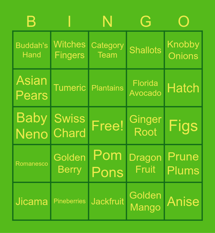 This bingo card has a free space and 71 words: Black Diamond Watermelon, Witches Fingers, Tatayoyo, Dekapon, Jackfruit, Turban Squash, Shallots, Indian Apple, Florida Avocado, Yucca, Jicama, Daikon, Hatch, Buddah's Hand, Black Truffles, Baby Neno, Dragon Fruit, Knobby Onions, Chayote, Figs, Golden Berry, Anise, Prune Plums, Cilantro, Kumquats, Passion Fruit, Persimmon, Cactus Pad, Honeyrock, Aloe, Pineberries, French Endive, Okra, Guava, Golden Mango, Zebra Lemon, Moro Orange, Rambutan, Asian Pears, Donut Peach, Pom Pons, Rapini, Romanesco, Tomitillo, Kiwano Melon, Carambola, Salad Savoy, Tumeric, Frisee, Oyster Mushrooms, Celery Root, Savoy Cabbage, Ginger Root, Gold Nuggets, Treviso, Tuscan Kale, Plantains, Pummelo, Turnips, Rutabaga, Papaya, Rhubarb, Swiss Chard, Ugli Fruit, Dinosaur Eggs, Santa Clause, Category Team, Specialist Team, Mangostene, Cherimoya and Artichokes.