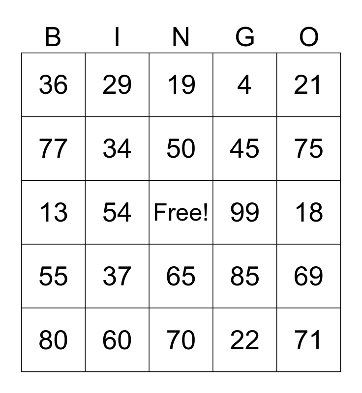 This bingo card has a free space and 24 words: 37, 60, 50, 80, 21, 36, 77, 29, 99, 65, 45, 13, 85, 69, 34, 22, 18, 19, 75, 54, 71, 55, 4 and 70.