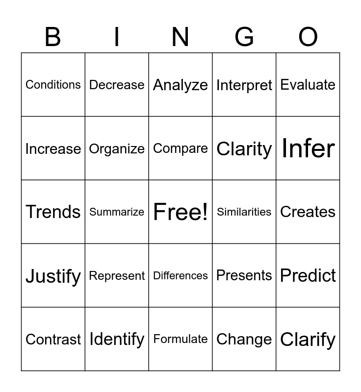 This bingo card has a free space and 24 words: Represent, Identify, Compare, Contrast, Evaluate, Conditions, Increase, Decrease, Similarities, Differences, Clarity, Trends, Presents, Predict, Organize, Change, Creates, Analyze, Infer, Summarize, Clarify, Justify, Interpret and Formulate.