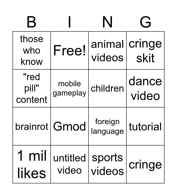 This bingo card has 19 words: foreign language, ranking ___, animal videos, cringe, tutorial, "red pill" content, sports videos, those who know, Free!, brainrot, Gmod, mobile gameplay, children, untitled video, 1 mil likes, food video, cringe skit, dance video and racism.
