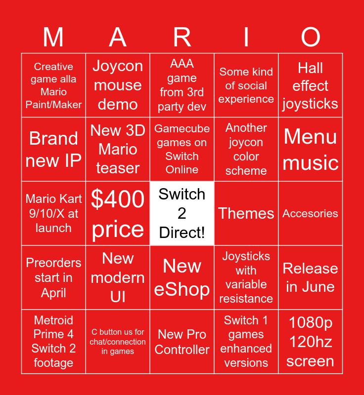 This bingo card has a free space and 24 words: New modern UI, C button us for chat/connection in games, Gamecube games on Switch Online, Metroid Prime 4 Switch 2 footage, Hall effect joysticks, Creative game alla Mario Paint/Maker, Brand new IP, Joycon mouse demo, Themes, New eShop, Another joycon color scheme, Mario Kart 9/10/X at launch, Joysticks with variable resistance, Release in June, New 3D Mario teaser, Switch 1 games enhanced versions, Accesories, AAA game from 3rd party dev, Menu music, $400 price, 1080p 120hz screen, Preorders start in April, Some kind of social experience and New Pro Controller.