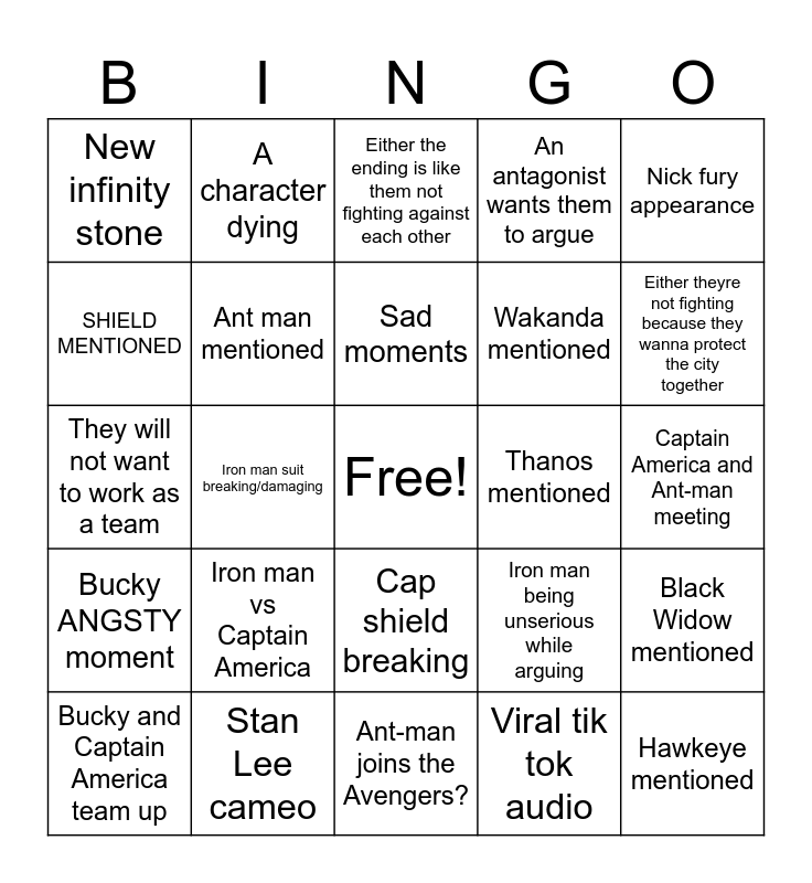 This bingo card has a free space and 24 words: Iron man vs Captain America, Stan Lee cameo, Sad moments, Bucky and Captain America team up, Nick fury appearance, New infinity stone, SHIELD MENTIONED, A character dying, Thanos mentioned, Cap shield breaking, Wakanda mentioned, They will not want to work as a team, Iron man being unserious while arguing, Black Widow mentioned, Ant man mentioned, Viral tik tok audio, Captain America and Ant-man meeting, Either the ending is like them not fighting against each other, Either theyre not fighting because they wanna protect the city together, Iron man suit breaking/damaging, Hawkeye mentioned, Bucky ANGSTY moment, An antagonist wants them to argue and Ant-man joins the Avengers?.