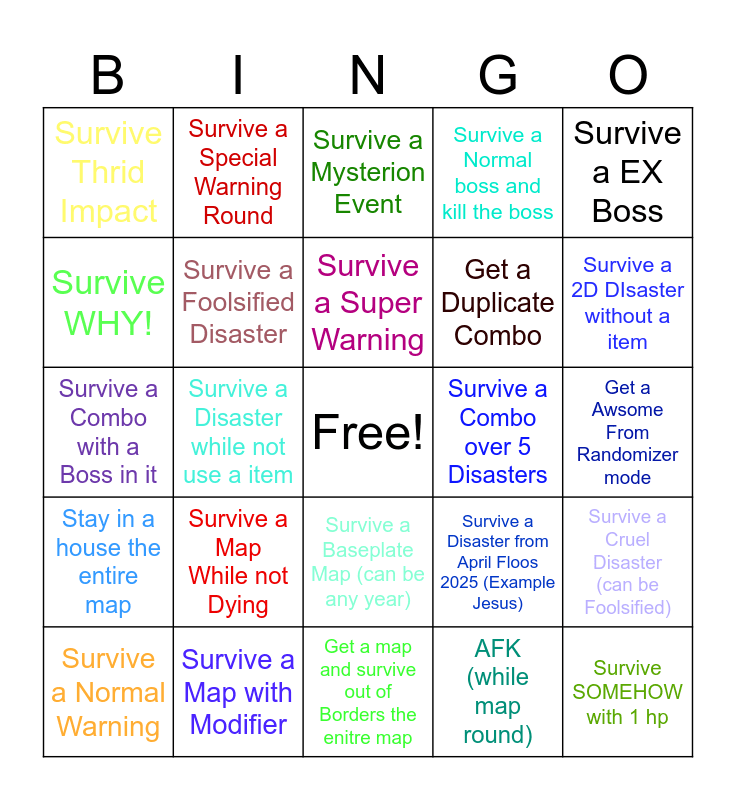 This bingo card has a free space and 24 words: Survive a Map While not Dying, Survive a Map with Modifier, Survive a Super Warning, Survive a Normal Warning, Survive a EX Boss, Survive Thrid Impact, Survive WHY!, Survive a Special Warning Round, Survive a Combo over 5 Disasters, Survive a Baseplate Map (can be any year), Get a Duplicate Combo, Survive a Combo with a Boss in it, Survive a Disaster from April Floos 2025 (Example Jesus), Survive a Cruel Disaster (can be Foolsified), Survive a Foolsified Disaster, AFK (while map round), Get a Awsome From Randomizer mode, Survive a Mysterion Event, Survive a 2D DIsaster without a item, Survive a Disaster while not use a item, Survive SOMEHOW with 1 hp, Stay in a house the entire map, Survive a Normal boss and kill the boss and Get a map and survive out of Borders the enitre map.
