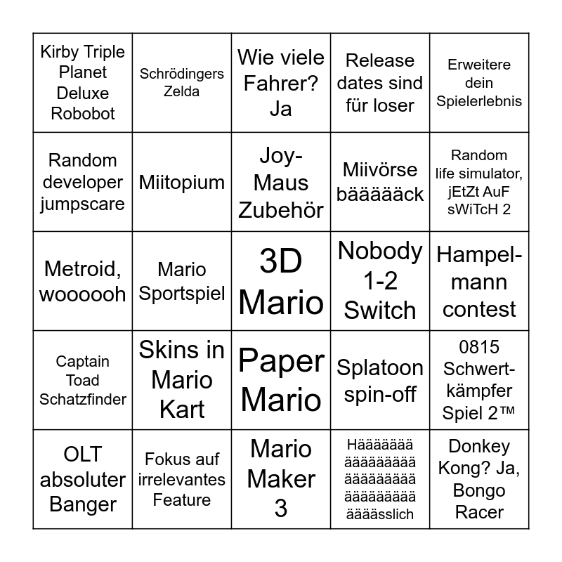 This bingo card has a free space and 24 words: Skins in Mario Kart, Fokus auf irrelevantes Feature, Joy-Maus Zubehör, OLT absoluter Banger, Erweitere dein Spielerlebnis, Kirby Triple Planet Deluxe Robobot, Random developer jumpscare, Schrödingers Zelda, Nobody 1-2 Switch, Paper Mario, Miivörse bäääääck, Metroid, woooooh, Splatoon spin-off, 0815 Schwert-kämpfer Spiel 2™, Miitopium, Häääääää äääääääää äääääääää äääääääää äääässlich, Hampel-mann contest, Wie viele Fahrer? Ja, Random life simulator, jEtZt AuF sWiTcH 2, Mario Sportspiel, Donkey Kong? Ja, Bongo Racer, Captain Toad Schatzfinder, Release dates sind für loser and Mario Maker 3.