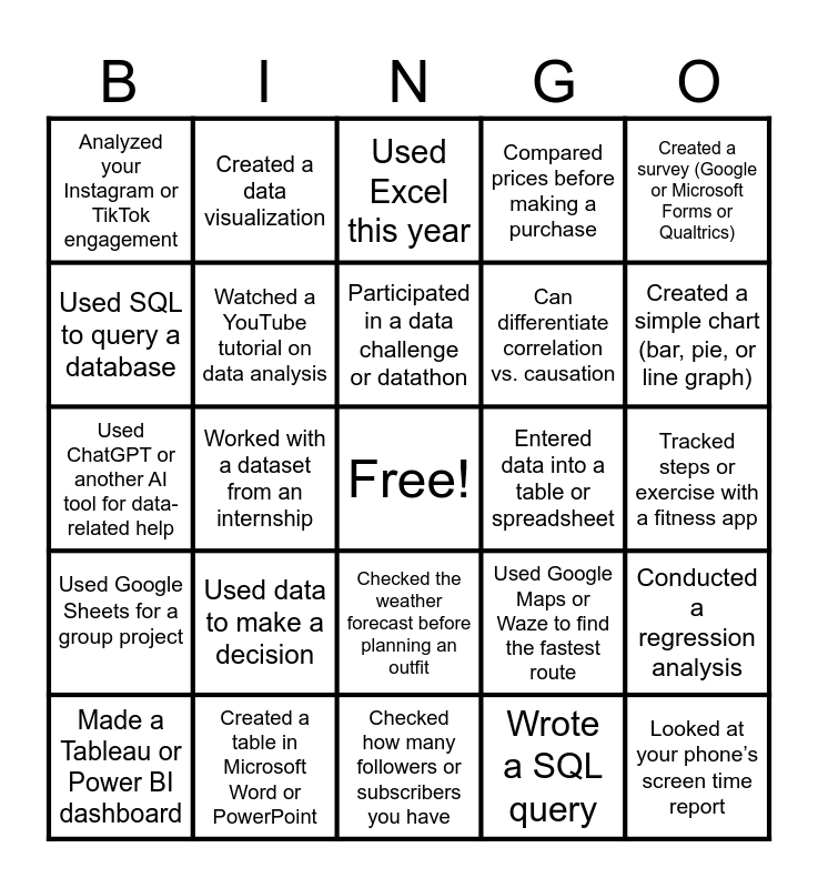 This bingo card has a free space and 34 words: Taken a DARTT Lab training, Wrote a SQL query, Python user, Analyzed social media metrics, Used Google Sheets for a group project, Watched a YouTube tutorial on data analysis, Created a survey (Google or Microsoft Forms or Qualtrics), Made a Tableau or Power BI dashboard, Created a data visualization, Attended a guest lecture or panel on data analytics, Participated in a data challenge or datathon, Used Excel this year, Gave a presentation using data, Explained a data concept to someone who didn’t understand it, Entered data into a table or spreadsheet, Created a simple chart (bar, pie, or line graph), Created a table in Microsoft Word or PowerPoint, Used ChatGPT or another AI tool for data-related help, Used data to make a decision, Used Google Maps or Waze to find the fastest route, Checked the weather forecast before planning an outfit, Tracked grades or GPA for academic progress, Analyzed your Instagram or TikTok engagement, Tracked steps or exercise with a fitness app, Checked how many followers or subscribers you have, Looked at your phone’s screen time report, Compared prices before making a purchase, Downloaded data from a website, Can differentiate correlation vs. causation, Used SQL to query a database, Asked a professor for help with a data-related question, Worked with a dataset from an internship, Conducted a regression analysis and Cleaned a dataset.