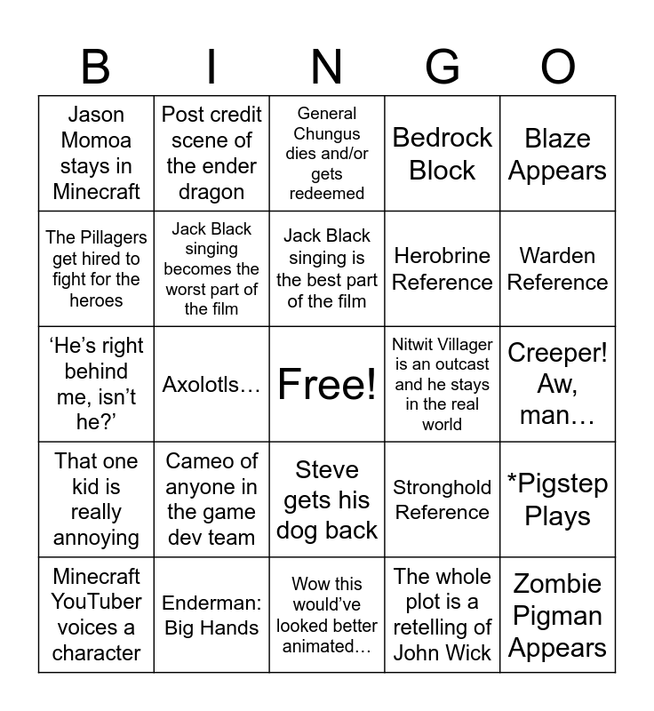 This bingo card has a free space and 24 words: Cameo of anyone in the game dev team, Enderman: Big Hands, Jack Black singing is the best part of the film, Minecraft YouTuber voices a character, Blaze Appears, Jason Momoa stays in Minecraft, The Pillagers get hired to fight for the heroes, Post credit scene of the ender dragon, Nitwit Villager is an outcast and he stays in the real world, Steve gets his dog back, Herobrine Reference, ‘He’s right behind me, isn’t he?’, Stronghold Reference, *Pigstep Plays, Jack Black singing becomes the worst part of the film, The whole plot is a retelling of John Wick, Creeper! Aw, man…, General Chungus dies and/or gets redeemed, Warden Reference, Axolotls…, Zombie Pigman Appears, That one kid is really annoying, Bedrock Block and Wow this would’ve looked better animated….