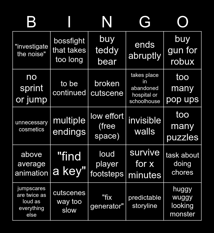 This bingo card has a free space and 49 words: disconnected, huggy wuggy looking monster, actually scary (rare), "fix generator", "find a key", AI generated thumbnail, bossfight that takes too long, super slow walking speed, no sprint or jump, stolen assets, to be continued, ends abruptly, task about doing chores, survive for x minutes, 5 nights, 3 lives, broken cutscene, invisible walls, goofy monster, buy gun for robux, multiple endings, predictable storyline, "investigate the noise", takes place in abandoned hospital or schoolhouse, "add to favorites" pop up, too many pop ups, jumpscares are twice as loud as everything else, png jumpscare, loud player footsteps, above average animation, bad voice acting, tedious gameplay, maze, lose all progress when dead, cutscenes way too slow, broken enemy AI, got soft locked, suddenly parkour, too many puzzles, stamina runs out too fast, game has more likes than dislikes, game has more dislikes than likes, players in the lobby being cringe, meme sfx, unnecessary cosmetics, buy teddy bear, unnecessary flashing lights, flashlight battery and buggy.