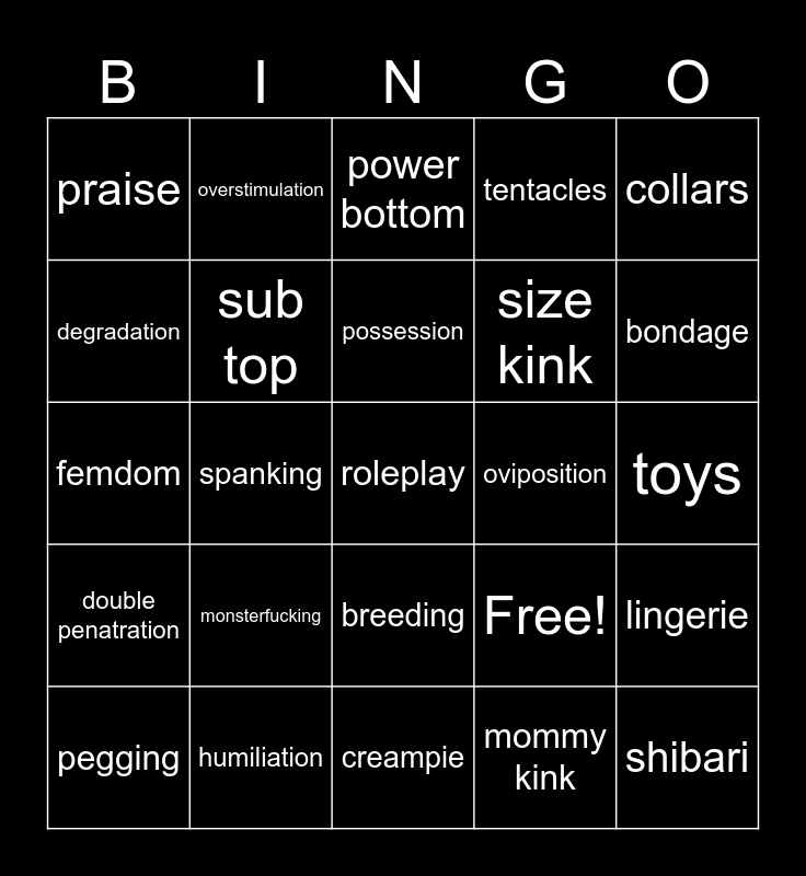 This bingo card has 25 words: monsterfucking, creampie, possession, pegging, collars, praise, degradation, overstimulation, oviposition, breeding, size kink, femdom, Free!, lingerie, sub top, shibari, toys, power bottom, bondage, spanking, roleplay, humiliation, double penatration, tentacles and mommy kink.