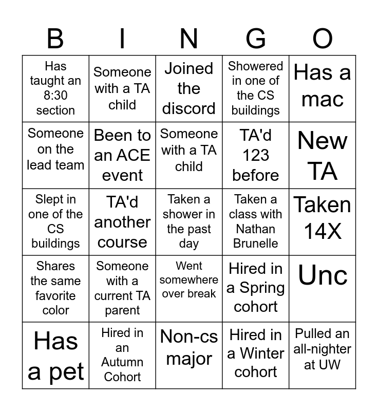 This bingo card has a free space and 24 words: Someone with a current TA parent, Hired in an Autumn Cohort, Someone with a TA child, Has a pet, Has a mac, Has taught an 8:30 section, Someone on the lead team, Someone with a TA child, Taken a class with Nathan Brunelle, Went somewhere over break, TA'd 123 before, Slept in one of the CS buildings, Hired in a Spring cohort, Unc, Been to an ACE event, Hired in a Winter cohort, Taken 14X, Joined the discord, New TA, TA'd another course, Pulled an all-nighter at UW, Shares the same favorite color, Showered in one of the CS buildings and Non-cs major.