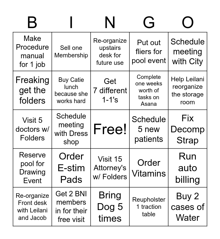This bingo card has a free space and 24 words: Order E-stim Pads, Get 2 BNI members in for their free visit, Get 7 different 1-1's, Re-organize Front desk with Leilani and Jacob, Schedule meeting with City, Make Procedure manual for 1 job, Freaking get the folders, Sell one Membership, Schedule 5 new patients, Visit 15 Attorney's w/ Folders, Complete one weeks worth of tasks on Asana, Visit 5 doctors w/ Folders, Order Vitamins, Run auto billing, Buy Catie lunch because she works hard, Reupholster 1 traction table, Fix Decomp Strap, Re-organize upstairs desk for future use, Help Leilani reorganize the storage room, Schedule meeting with Dress shop, Buy 2 cases of Water, Reserve pool for Drawing Event, Put out fliers for pool event and Bring Dog 5 times.