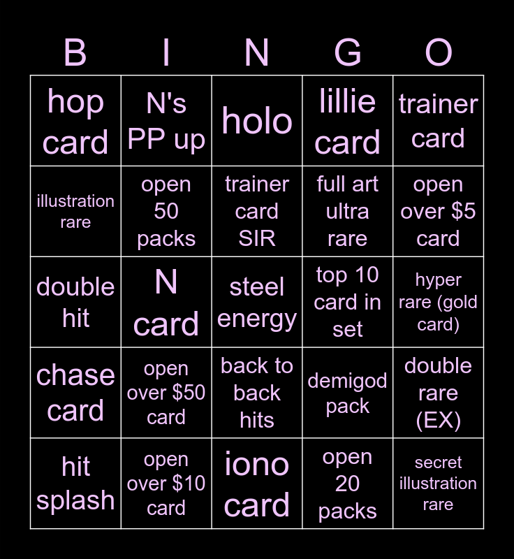 This bingo card has a free space and 24 words: open over $50 card, open over $10 card, trainer card SIR, hit splash, trainer card, hop card, illustration rare, N's PP up, top 10 card in set, back to back hits, full art ultra rare, double hit, demigod pack, double rare (EX), open 50 packs, open 20 packs, hyper rare (gold card), holo, open over $5 card, N card, secret illustration rare, chase card, lillie card and iono card.