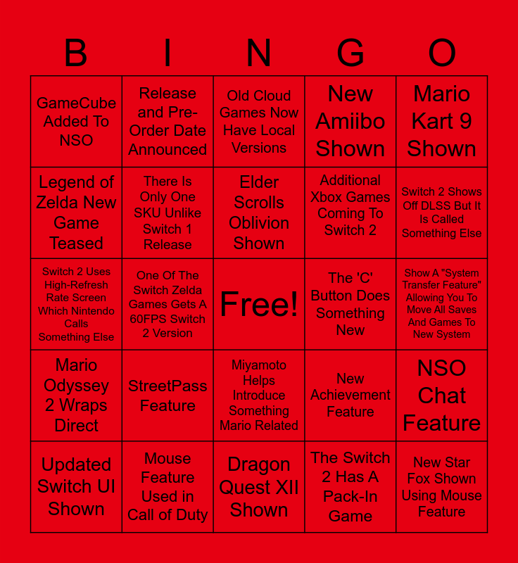 This bingo card has a free space and 24 words: StreetPass Feature, Mouse Feature Used in Call of Duty, Elder Scrolls Oblivion Shown, Updated Switch UI Shown, Mario Kart 9 Shown, GameCube Added To NSO, Legend of Zelda New Game Teased, Release and Pre-Order Date Announced, The 'C' Button Does Something New, Miyamoto Helps Introduce Something Mario Related, Additional Xbox Games Coming To Switch 2, Switch 2 Uses High-Refresh Rate Screen Which Nintendo Calls Something Else, New Achievement Feature, NSO Chat Feature, There Is Only One SKU Unlike Switch 1 Release, The Switch 2 Has A Pack-In Game, Show A "System Transfer Feature" Allowing You To Move All Saves And Games To New System, Old Cloud Games Now Have Local Versions, Switch 2 Shows Off DLSS But It Is Called Something Else, One Of The Switch Zelda Games Gets A 60FPS Switch 2 Version, New Star Fox Shown Using Mouse Feature, Mario Odyssey 2 Wraps Direct, New Amiibo Shown and Dragon Quest XII Shown.