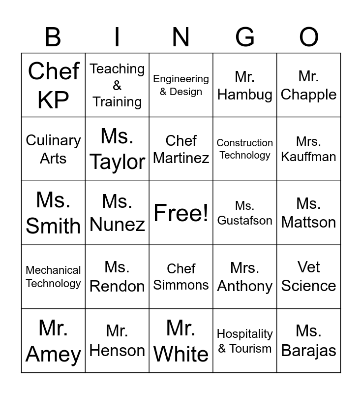 This bingo card has a free space and 28 words: Vet Science, Biomedical Science, Construction Technology, Hospitality & Tourism, Culinary Arts, Engineering & Design, Teaching & Training, Mechanical Technology, Ms. Gustafson, Mr. Amey, Ms. Smith, Mr. Hambug, Mr. Henson, Mr. White, Mrs. Kauffman, Mr. Jacobs, Ms. Rendon, Ms. Taylor, Chef Martinez, Chef Simmons, Chef KP, Mr. Oranchak, Ms. Barajas, Ms. Nunez, Ms. Mattson, Mrs. Anthony, Mr. Chapple and Mr. Cardy.