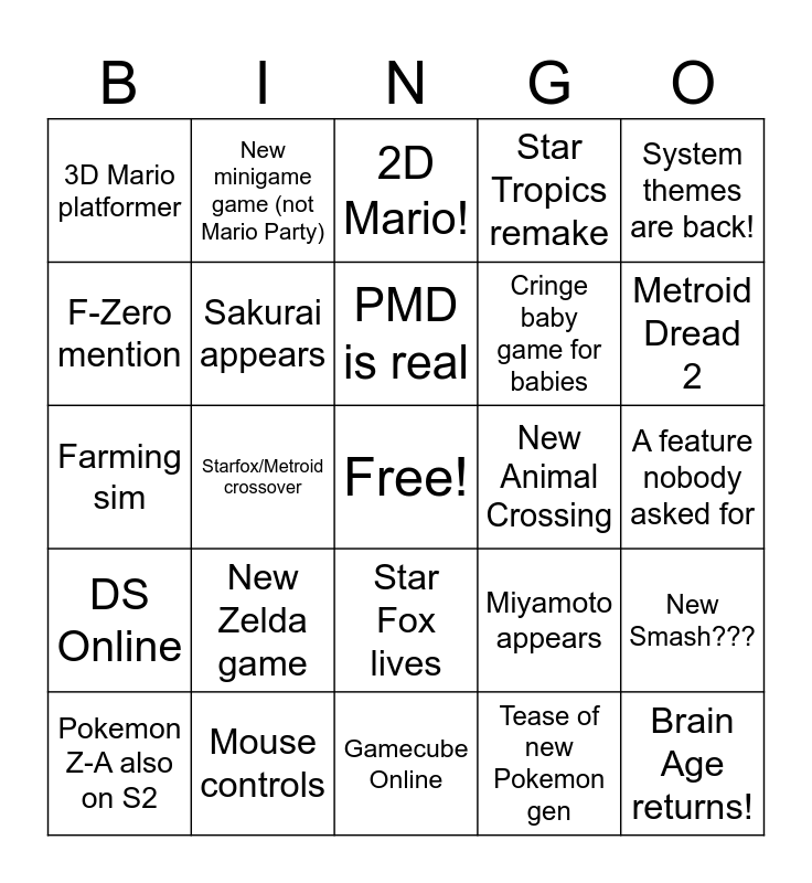 This bingo card has a free space and 24 words: New Zelda game, Mouse controls, PMD is real, Pokemon Z-A also on S2, System themes are back!, 3D Mario platformer, F-Zero mention, New minigame game (not Mario Party), New Animal Crossing, Star Fox lives, Cringe baby game for babies, Farming sim, Miyamoto appears, New Smash???, Sakurai appears, Tease of new Pokemon gen, A feature nobody asked for, 2D Mario!, Metroid Dread 2, Starfox/Metroid crossover, Brain Age returns!, DS Online, Star Tropics remake and Gamecube Online.