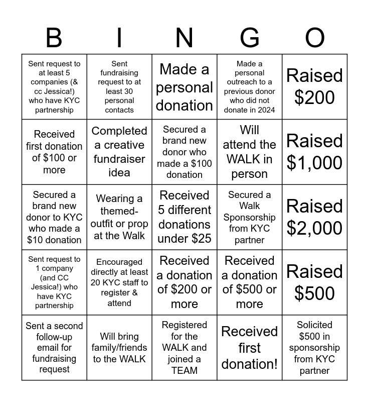 This bingo card has 25 words: Sent request to 1 company (and CC Jessica!) who have KYC partnership, Will bring family/friends to the WALK, Received 5 different donations under $25, Received first donation!, Raised $200, Sent request to at least 5 companies (& cc Jessica!) who have KYC partnership, Sent fundraising request to at least 30 personal contacts, Made a personal donation, Secured a Walk Sponsorship from KYC partner, Raised $500, Received first donation of $100 or more, Completed a creative fundraiser idea, Registered for the WALK and joined a TEAM, Received a donation of $500 or more, Raised $1,000, Sent a second follow-up email for fundraising request, Wearing a themed-outfit or prop at the Walk, Secured a brand new donor who made a $100 donation, Will attend the WALK in person, Raised $2,000, Secured a brand new donor to KYC who made a $10 donation, Encouraged directly at least 20 KYC staff to register & attend, Received a donation of $200 or more, Made a personal outreach to a previous donor who did not donate in 2024 and Solicited $500 in sponsorship from KYC partner.
