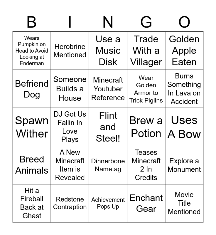 This bingo card has a free space and 28 words: Explore a Monument, Chicken Jockey!, Wear Golden Armor to Trick Piglins, Enchant Gear, Befriend Dog, Use a Music Disk, Herobrine Mentioned, Breed Animals, Brew a Potion, Hit a Fireball Back at Ghast, Spawn Wither, Trade With a Villager, Redstone Contraption, Achievement Pops Up, Burns Something In Lava on Accident, Dies and Comes Back Using Totem, A New Minecraft Item is Revealed, Someone Builds a House, Minecraft Youtuber Reference, Dinnerbone Nametag, Wears Pumpkin on Head to Avoid Looking at Enderman, Finds Diamonds, Movie Title Mentioned, DJ Got Us Fallin In Love Plays, Uses A Bow, Teases Minecraft 2 In Credits, Golden Apple Eaten and Breaks Out in Song.