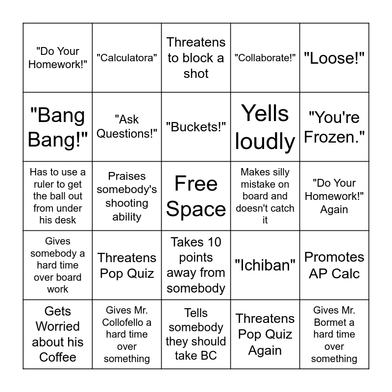 This bingo card has a free space and 24 words: Threatens Pop Quiz, Gives Mr. Collofello a hard time over something, "Buckets!", Gets Worried about his Coffee, "Loose!", "Do Your Homework!", "Bang Bang!", "Calculatora", Makes silly mistake on board and doesn't catch it, Takes 10 points away from somebody, Yells loudly, Has to use a ruler to get the ball out from under his desk, "Ichiban", Promotes AP Calc, "Ask Questions!", Threatens Pop Quiz Again, "Do Your Homework!" Again, Threatens to block a shot, "You're Frozen.", Praises somebody's shooting ability, Gives Mr. Bormet a hard time over something, Gives somebody a hard time over board work, "Collaborate!" and Tells somebody they should take BC.