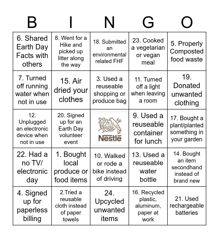 This bingo card has a free space and 24 words: 1. Bought local produce or food items, 2.Tried a reusable cloth instead of paper towels, 3. Used a reuseable shopping or produce bag, 4. Signed up for paperless billing, 5. Properly Composted food waste, 6. Shared Earth Day Facts with others, 7. Turned off running water when not in use, 8. Went for a Hike and picked up litter along the way, 9. Used a reuseable container for lunch, 10. Walked or rode a bike instead of driving, 11. Turned off a light when leaving a room, 12. Unplugged an electronic device when not in use, 13. Used a reuseable water bottle, 14. Bought an item secondhand instead of brand new, 15. Air dried your clothes, 16. Recycled plastic, aluminum, paper at work, 17. Bought a plant/planted something in your garden, 18. Submitted an environmental related FHF, 19. Donated unwanted clothing, 20. Signed up for an Earth Day volunteer event, 21. Used rechargeable batteries, 22. Had a no TV/ electronic day, 23. Cooked a vegetarian or vegan meal and 24. Upcycled unwanted items.