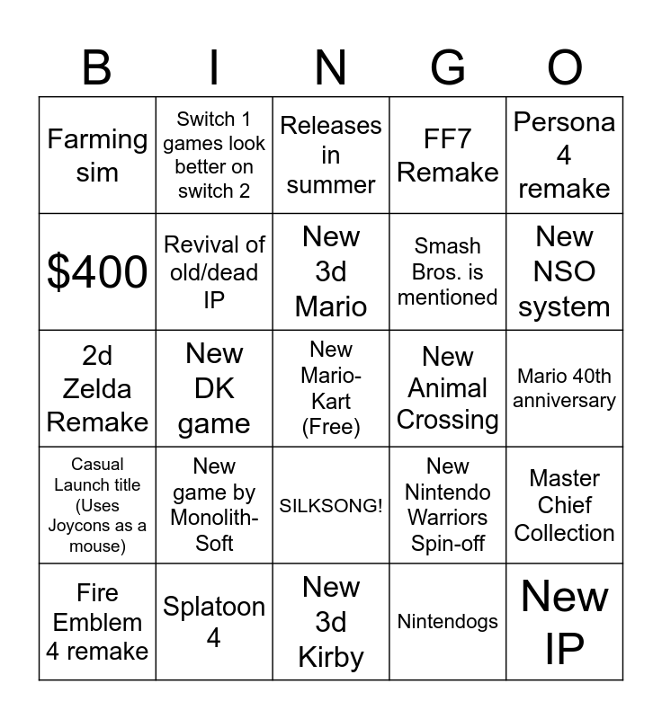 This bingo card has a free space and 24 words: New game by Monolith-Soft, Splatoon 4, New 3d Mario, Fire Emblem 4 remake, Persona 4 remake, Farming sim, $400, Switch 1 games look better on switch 2, New Animal Crossing, SILKSONG!, Smash Bros. is mentioned, 2d Zelda Remake, New Nintendo Warriors Spin-off, Master Chief Collection, Revival of old/dead IP, Nintendogs, Mario 40th anniversary, Releases in summer, New NSO system, New DK game, New IP, Casual Launch title (Uses Joycons as a mouse), FF7 Remake and New 3d Kirby.