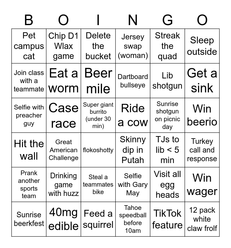 This bingo card has 36 words: Selfie with Gary May, Steal a teammates bike, Tahoe speedball before 10am, Join class with a teammate, Hit the wall, Ride a cow, Eat a worm, Feed a squirrel, Streak the quad, Visit all egg heads, Get a sink, Jersey swap (woman), Win wager, Case race, Dartboard bullseye, Pet campus cat, Prank another sports team, Sunrise shotgun on picnic day, Selfie with preacher guy, Delete the bucket, Super giant burrito (under 30 min), Great American Challenge, Skinny dip in Putah, flokoshotty, TJs to lib < 5 min, Chip D1 Wlax game, Lib shotgun, 40mg edible, Beer mile, Sleep outside, 12 pack white claw frolf, Sunrise beerkfest, Turkey call and response, Win beerio, Drinking game with huzz and TikTok feature.