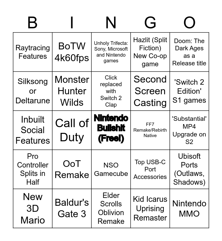 This bingo card has a free space and 24 words: OoT Remake, Baldur's Gate 3, Click replaced with Switch 2 Clap, New 3D Mario, Doom: The Dark Ages as a Release title, Raytracing Features, Silksong or Deltarune, BoTW 4k60fps, FF7 Remake/Rebirth Native, NSO Gamecube, Second Screen Casting, Inbuilt Social Features, Top USB-C Port Accessories, Ubisoft Ports (Outlaws, Shadows), Monster Hunter Wilds, Kid Icarus Uprising Remaster, 'Substantial' MP4 Upgrade on S2, Unholy Trifecta: Sony, Microsoft and Nintendo games, 'Switch 2 Edition' S1 games, Call of Duty, Nintendo MMO, Pro Controller Splits in Half, Hazlit (Split Fiction) New Co-op game and Elder Scrolls Oblivion Remake.