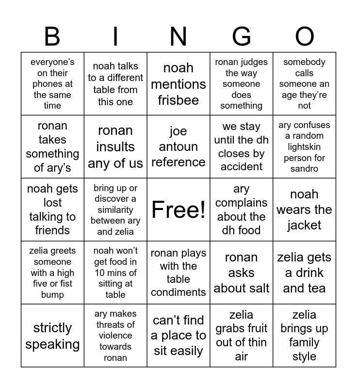 This bingo card has a free space and 24 words: noah won’t get food in 10 mins of sitting at table, ary makes threats of violence towards ronan, joe antoun reference, strictly speaking, somebody calls someone an age they’re not, everyone’s on their phones at the same time, ronan takes something of ary’s, noah talks to a different table from this one, ary complains about the dh food, ronan plays with the table condiments, we stay until the dh closes by accident, noah gets lost talking to friends, ronan asks about salt, zelia gets a drink and tea, ronan insults any of us, zelia grabs fruit out of thin air, noah wears the jacket, noah mentions frisbee, ary confuses a random lightskin person for sandro, bring up or discover a similarity between ary and zelia, zelia brings up family style, zelia greets someone with a high five or fist bump, ronan judges the way someone does something and can’t find a place to sit easily.